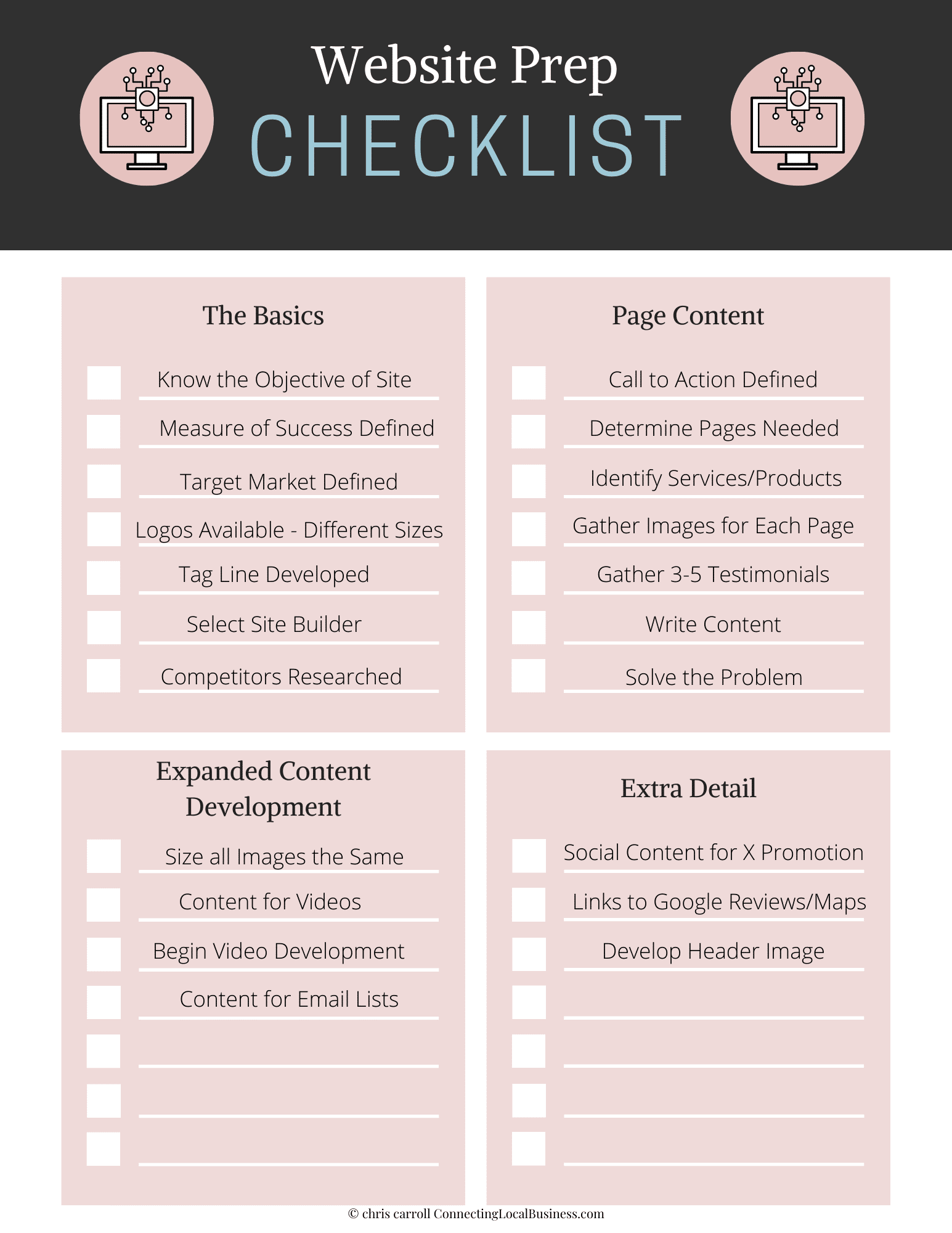 This checklist is perfect for planning out your needs before you start or as you build.